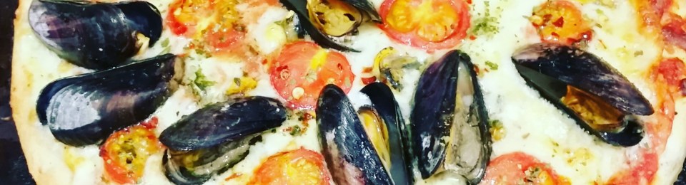 After their filtration Dan removed them carefully from their shells and set them aside. I put them on top of a cheese and tomato pizza, along with some mussels, and finished the pizza with coriander, chilli, tomatoes and a drizzle of garlic-infused olive oil and some freshly ground black pepper, and baked the pizza in oven at 200C fan for around 8-10 minutes, by which time the dough and toppings were cooked through and the mussels had opened.