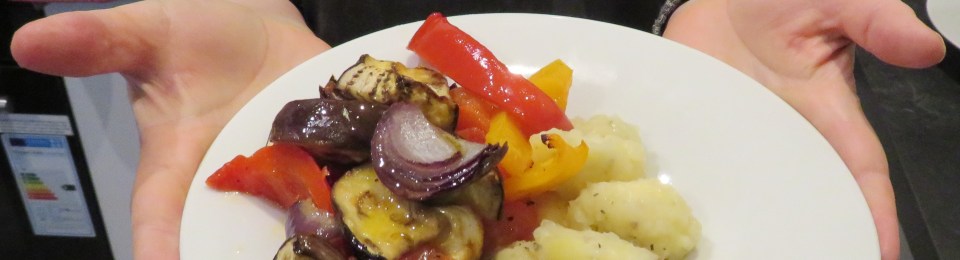 For a heartier plate and to keep this recipe vegan, any tomato-based sauce goes well with gnocchi, whether you roast whole cherry tomatoes in an oven with garlic and balsamic vinegar or use tinned chopped tomatoes. For a vegetarian, gnocchi can be enjoyed with roasted butternut squash and goat’s cheese or perhaps some spinach and ricotta. I decided to serve the gnocchi simply with a side of roasted Mediterranean vegetables – diced aubergine (eggplant), roughly chopped onions, tomatoes, courgette, tomatoes and bell peppers and a drizzle of balsamic vinegar.